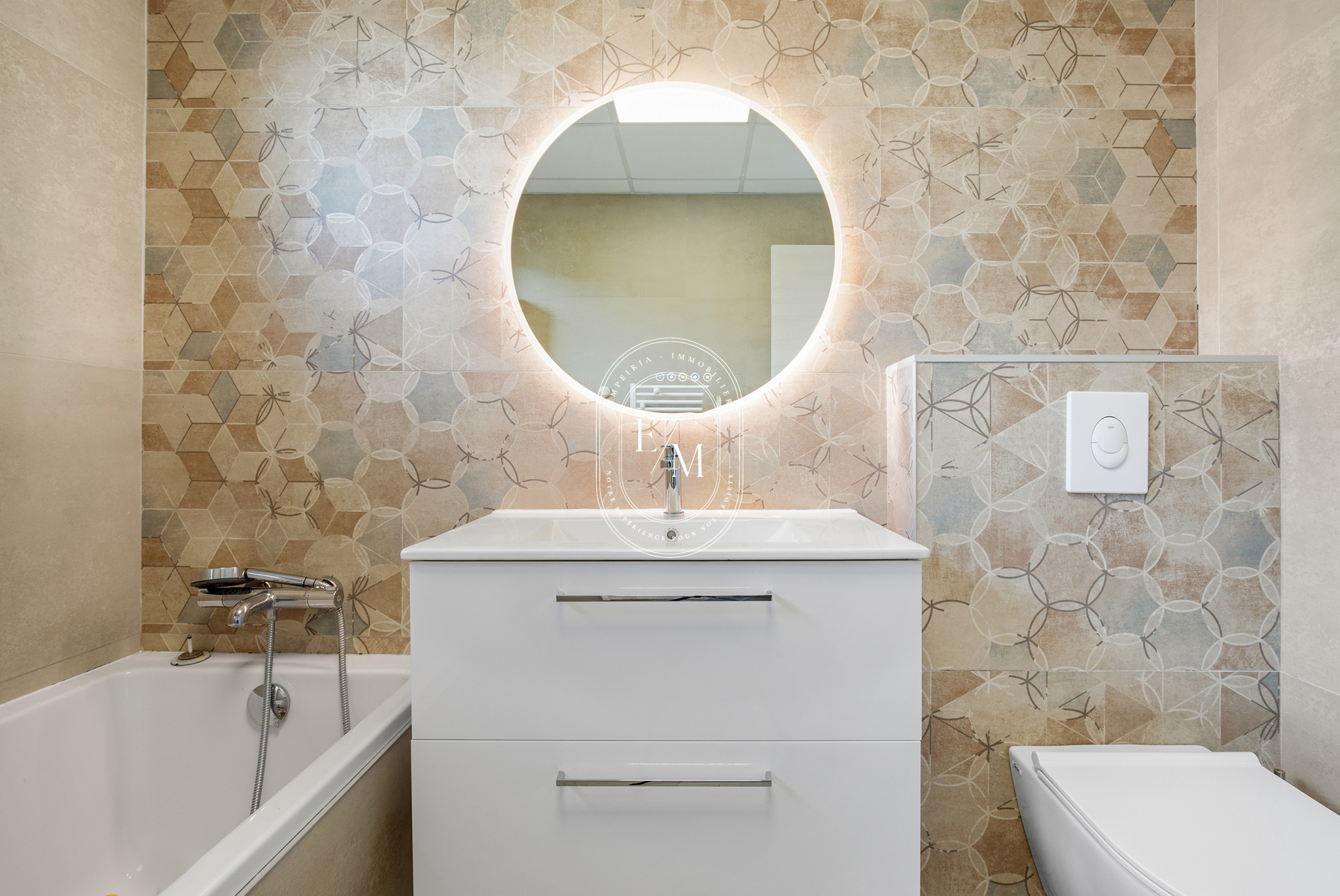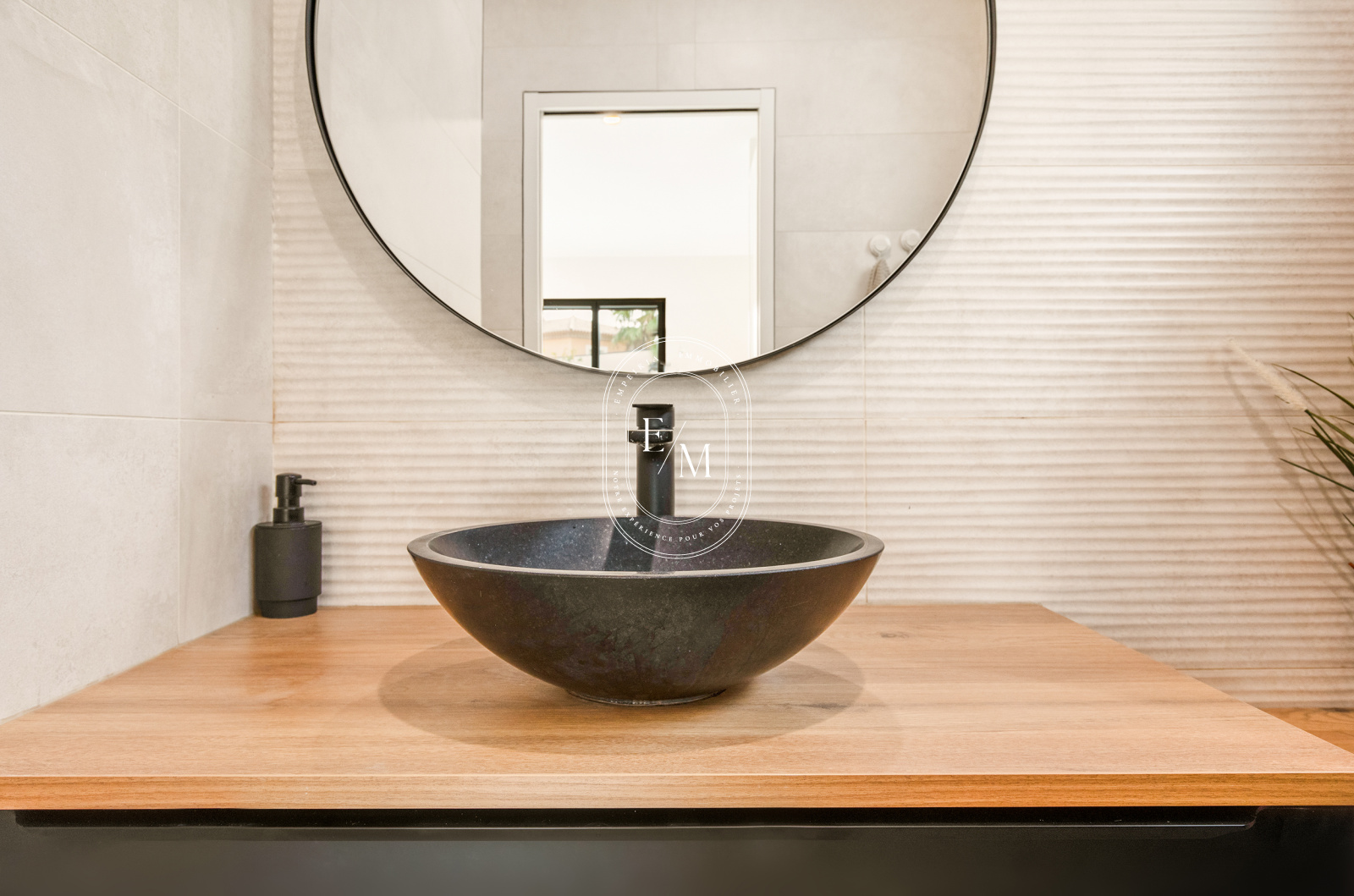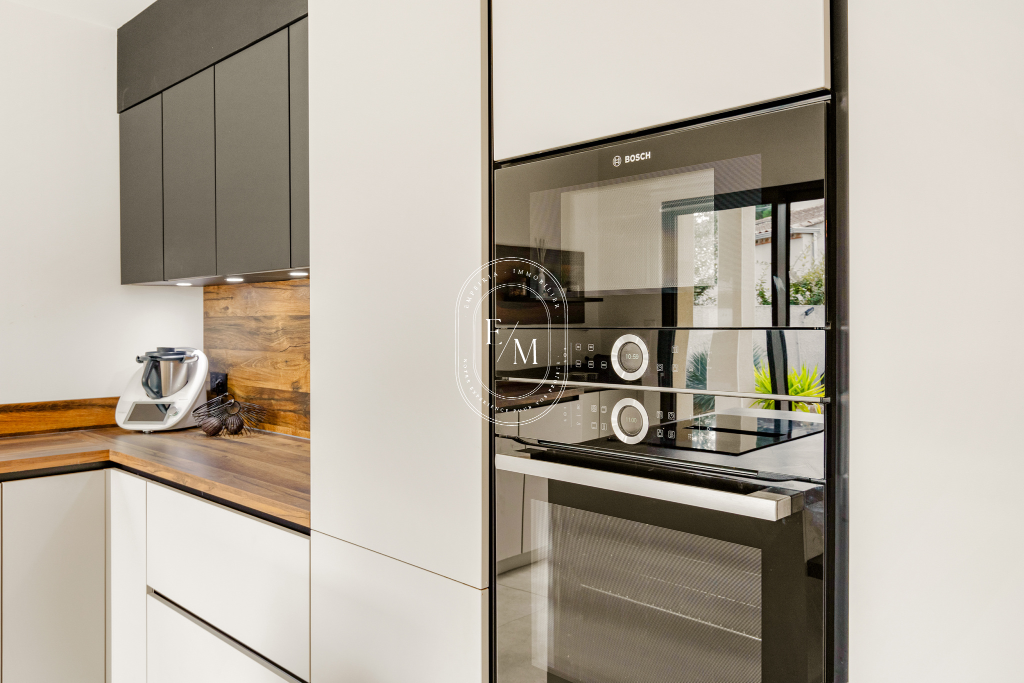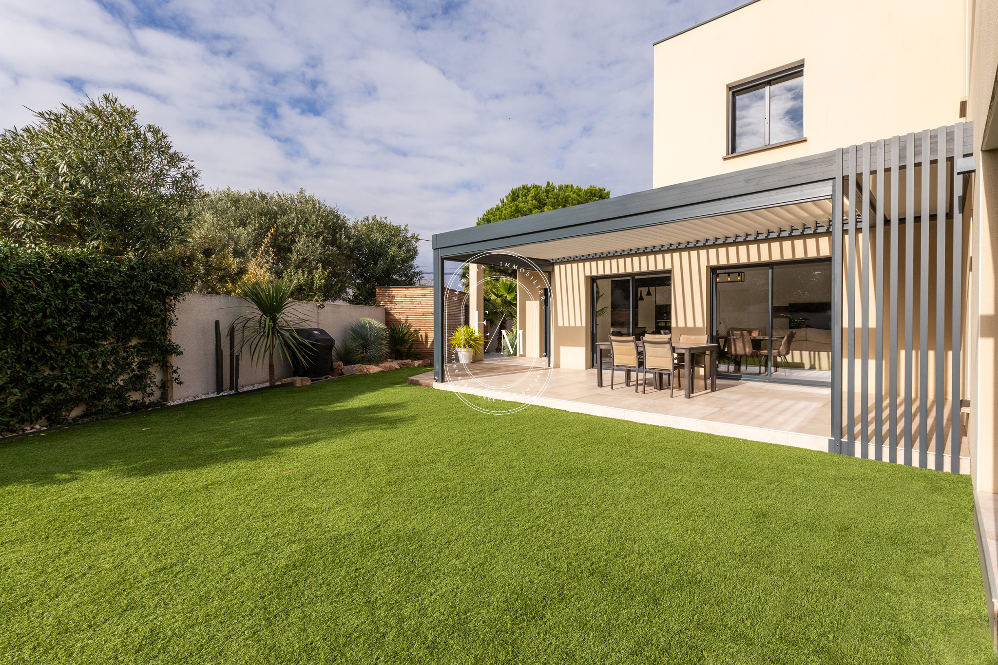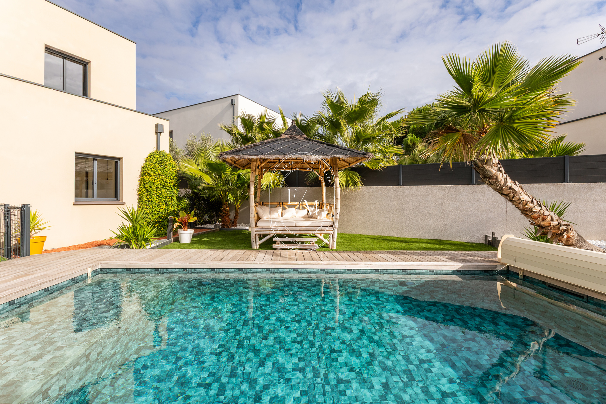 À l’extérieur, le jardin paysagé invite à la détente. La piscine chauffée, orientée sud-est et équipée d’un volet roulant se prolonge sur une terrasse en bois d’ipé. Sa membrane armée effet carreaux de Bali et son Bali patio insufflent une atmosphère zen et tropicale, idéale pour les moments de repos ou les soirées d’été.