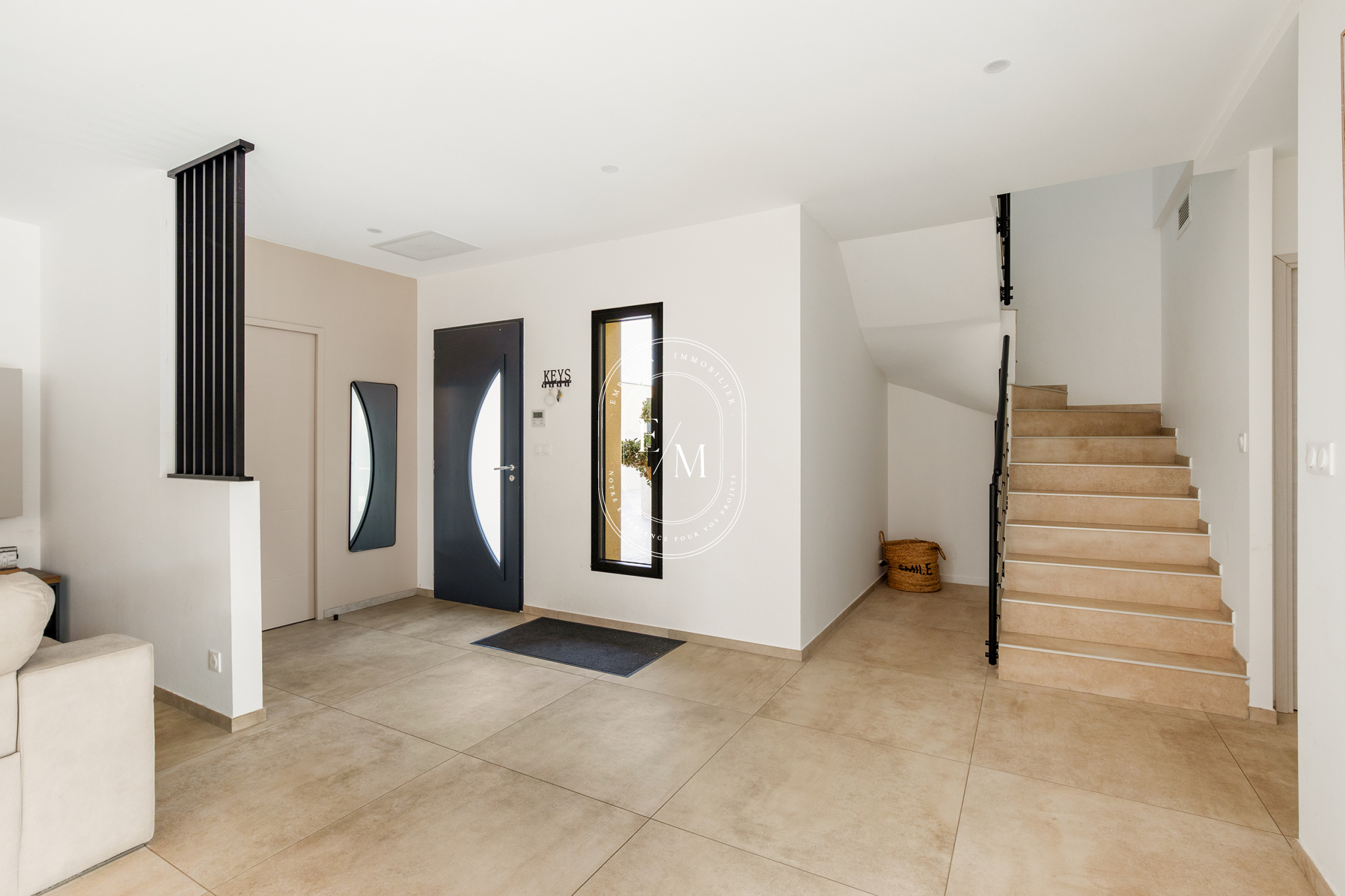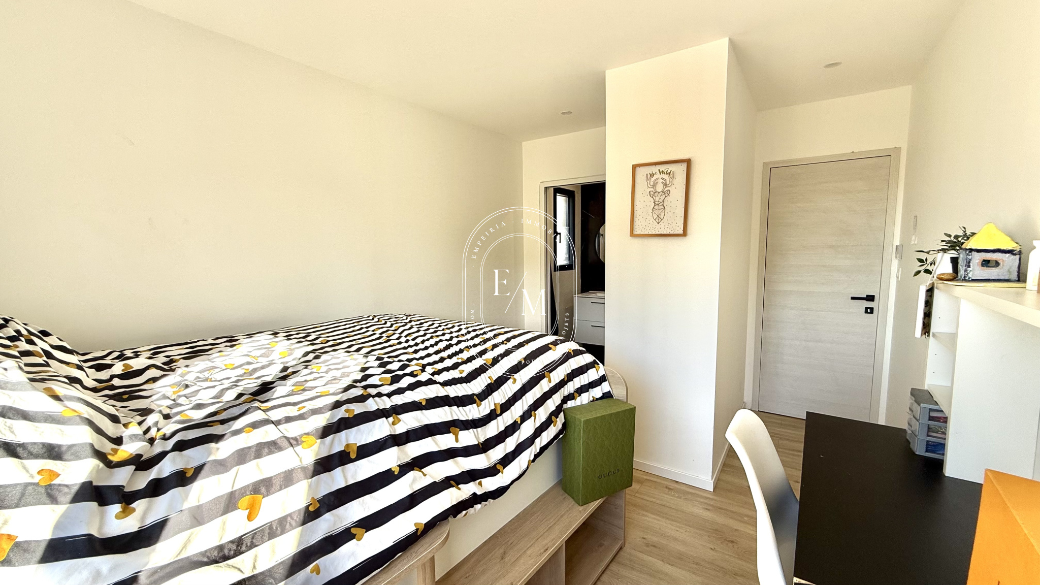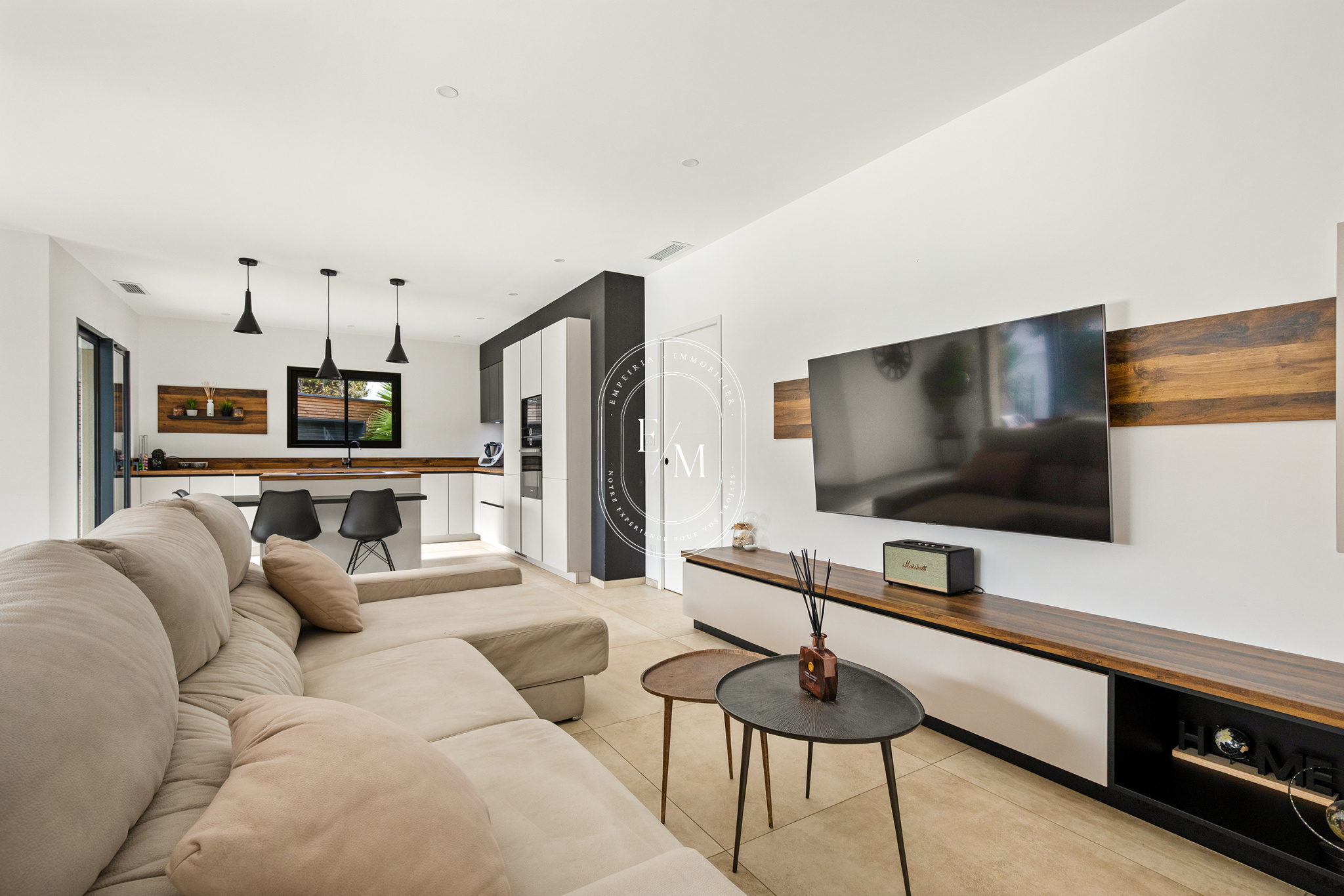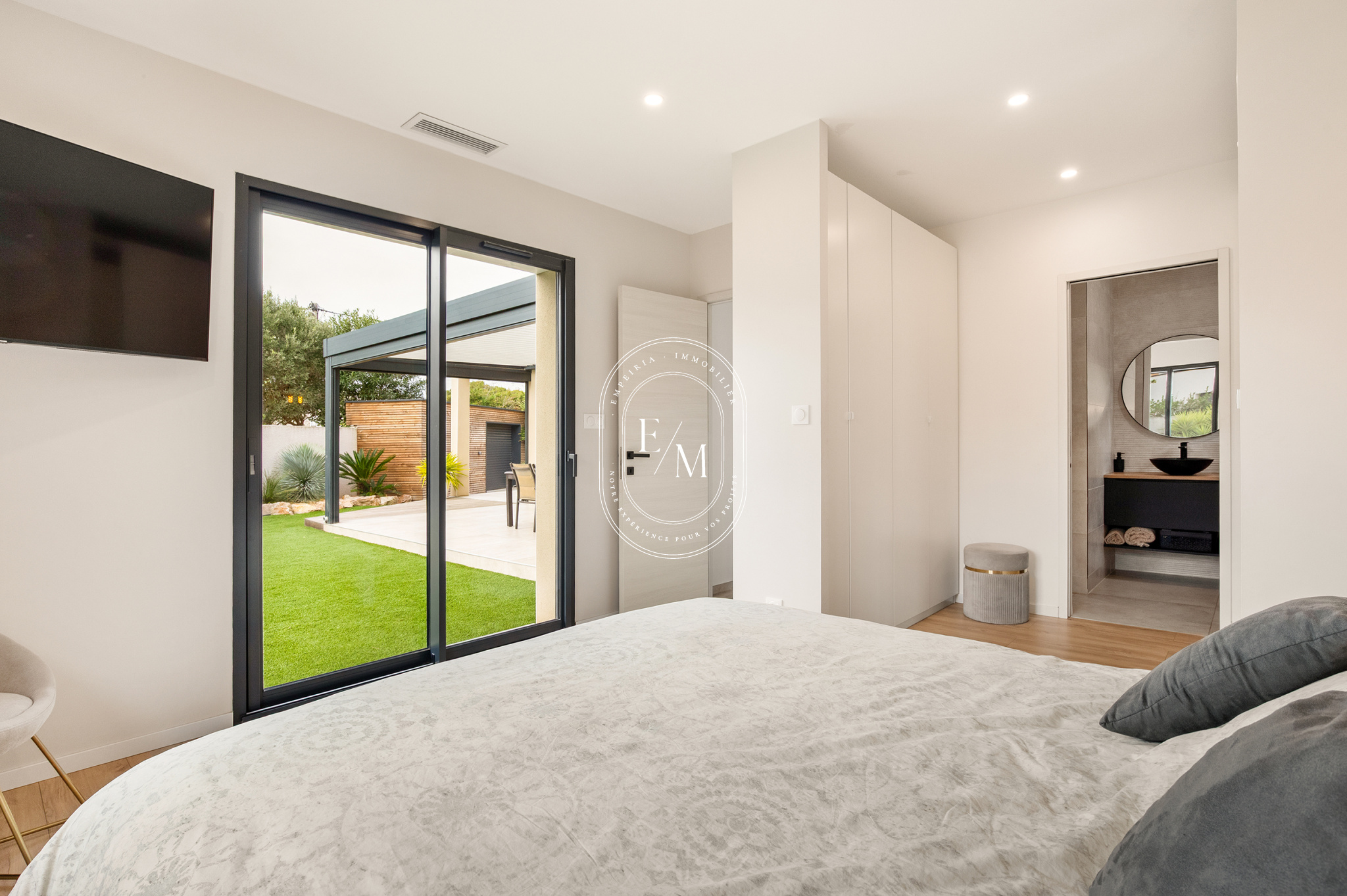 Dès l’entrée, les volumes et la luminosité séduisent. Le séjour spacieux, orienté plein sud, s’ouvre sur une cuisine moderne entièrement équipée et sur une terrasse carrelée, ombragée par une pergola bioclimatique, véritable prolongement de l’espace de vie. Les baies vitrées en aluminium assurent une continuité harmonieuse entre intérieur et extérieur, dans un esprit résolument contemporain.
