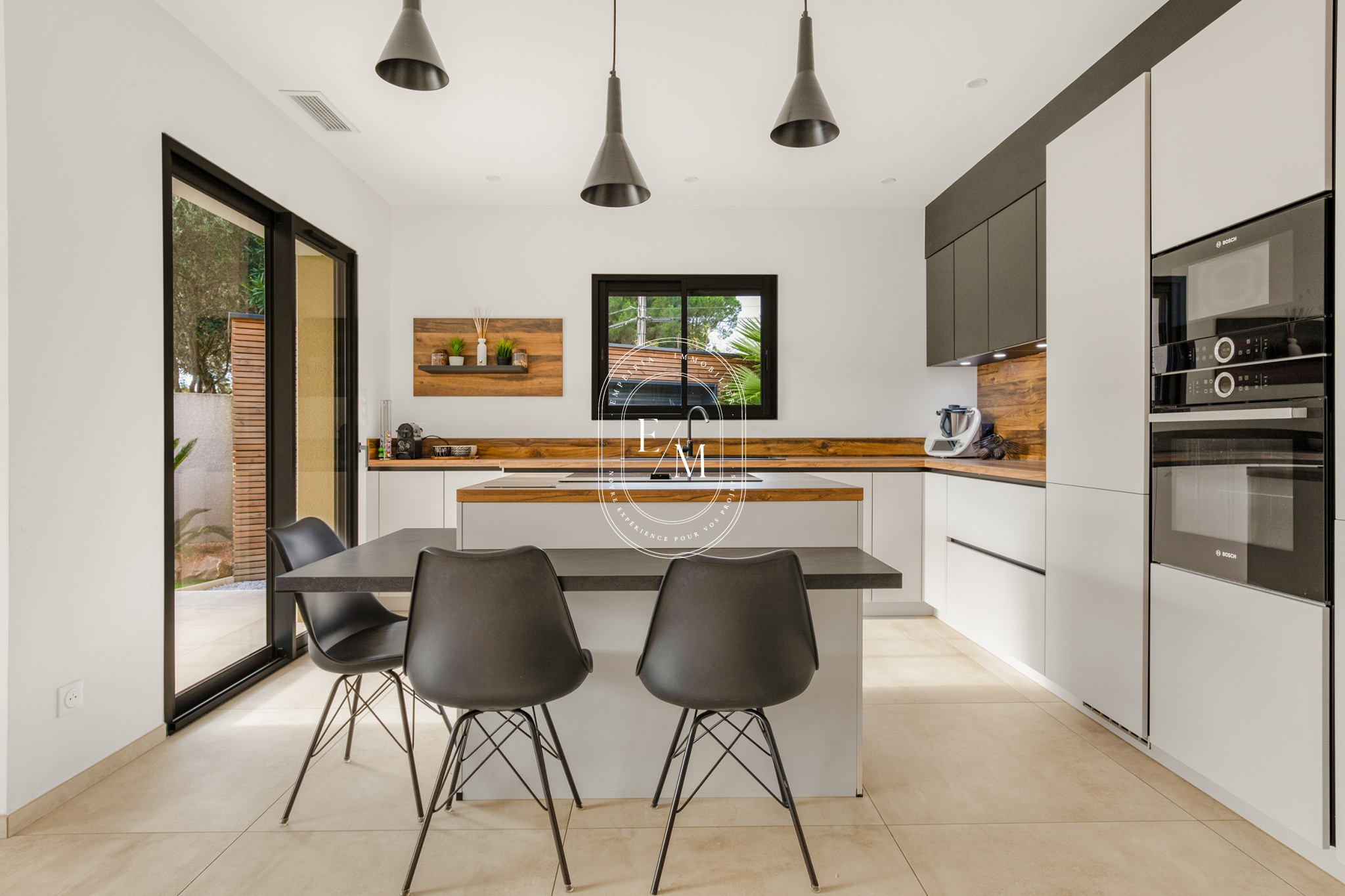 La maison bénéficie de prestations haut de gamme : climatisation gainable intégrée, menuiseries aluminium, borne de recharge pour véhicule électrique, panneaux solaires pour une meilleure performance énergétique, et des finitions soignées dans chaque espace.
