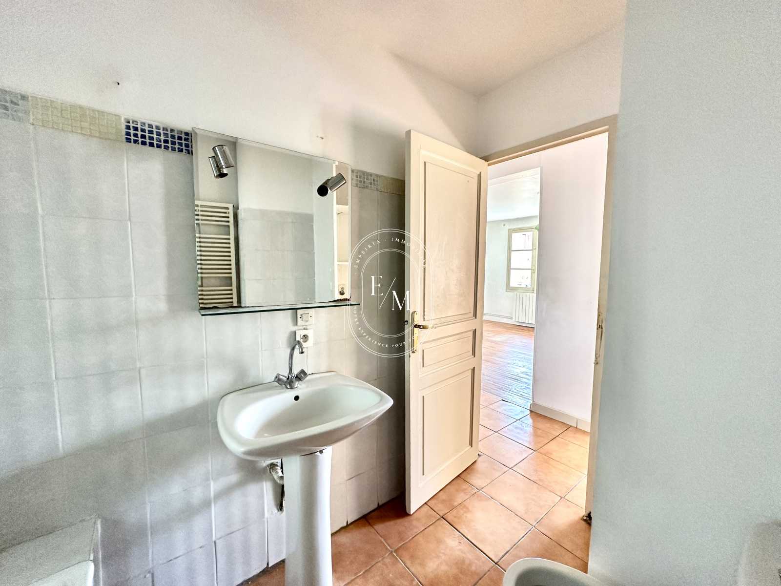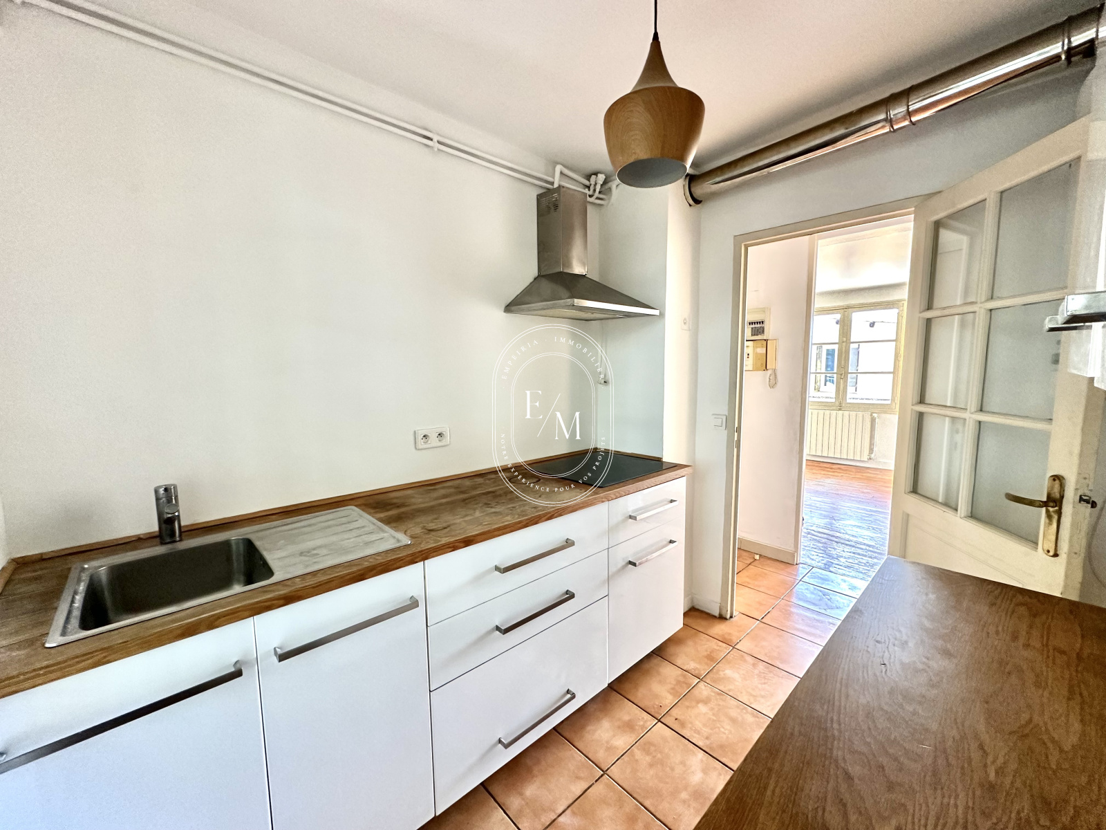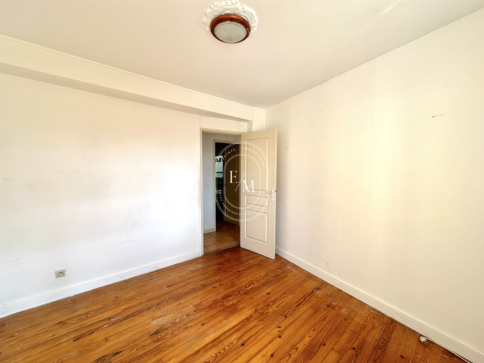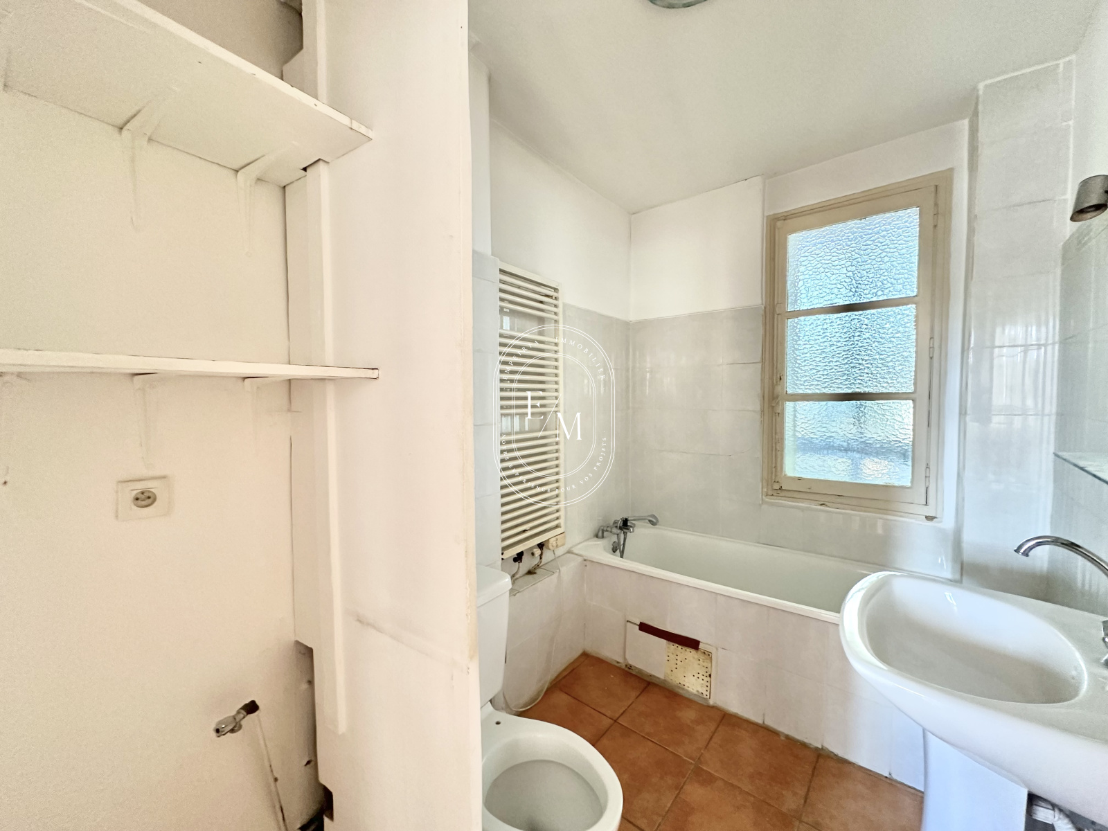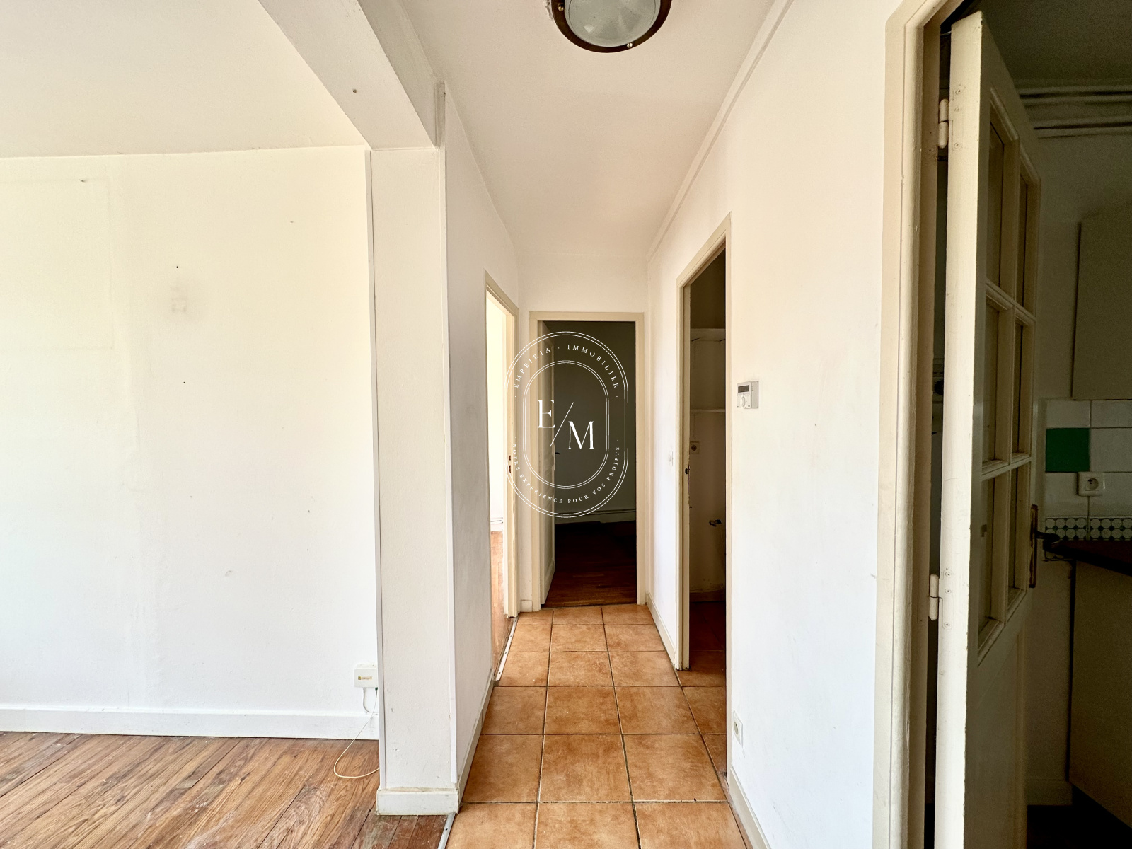 L’appartement se compose d’une entrée desservant d’un côté le séjour, et de l’autre la cuisine. Quelques travaux permettront de relier ces deux espaces afin de créer un grand espace de vie généreux et lumineux. Au fond du couloir, vous trouverez deux chambres ainsi qu’une salle de bain avec fenêtre.